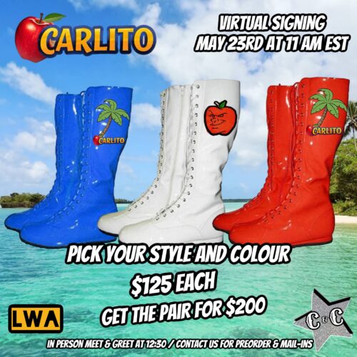 We are proud to offer an exclusive pre-order for a souvenir wrestling boots inspired by Carlito!