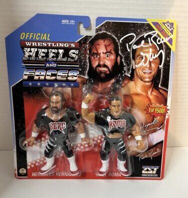 From explosive strength to picture-perfect teamwork, Paul Roma and Hercules brought charisma, power, and dominance to the squared circle. Now immortalized in the Wrestling’s Heels and Faces line and designed by icon Ron Rudat, this set captures their legendary look and energy — made even more special with Roma’s signature.
